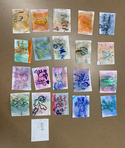 You can restrict the materials kids have access to based on grade level or time allotted. As for taking ownership of their work, students write their first name and last initial on the card. If they trade cards with kids from another school or town, there is some anonymity in not putting their whole name on the back.